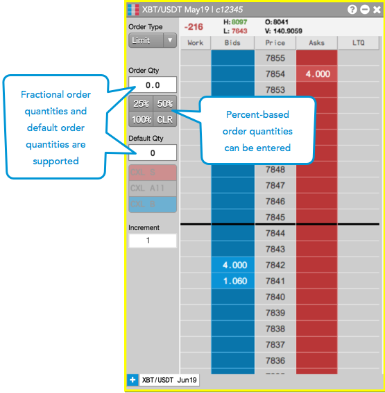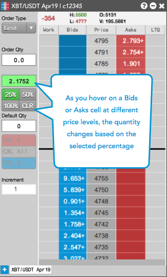 [Bids] 列にマウスをポイントすると、アセット ペア (XBT/USDT 等) のバック アセット (USDT 等) の利用可能な金額のパーセント数として、枚数欄が生成されます。[Bids] 列で各セルの上をマウスでポイントすると、枚数欄は各価格帯で自動的に更新されます。枚数欄は緑色に強調表示され、利用可能なアセット枚数のパーセント数を入力していることが示されます。
