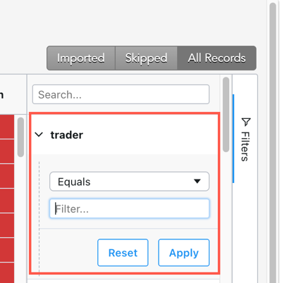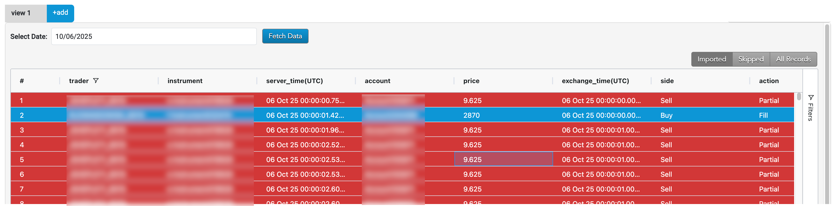 You can refine the data visible in the table by applying multiple column-level filters (e.g., trader, instrument, account, price, etc.) simultaneously.