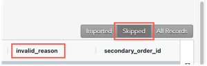 Skipped records appear in grey and contain an “invalid_reason” column which provides the reason the record was skipped.