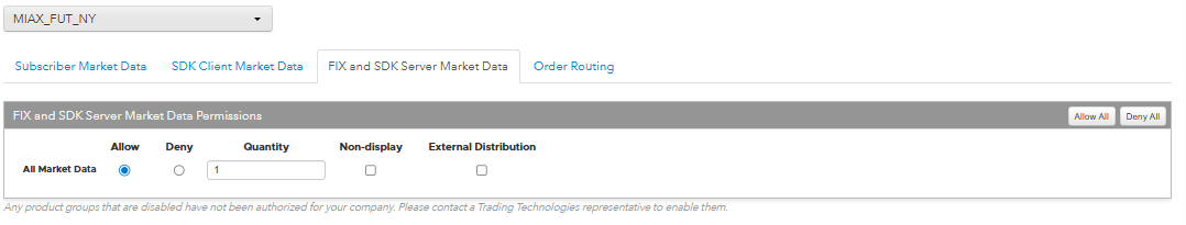 - Use the FIX and SDK Market Data tab to allow or deny user access to market data using FIX, TT .NET SDK Server Side, and TT Core SDK trading applications.
