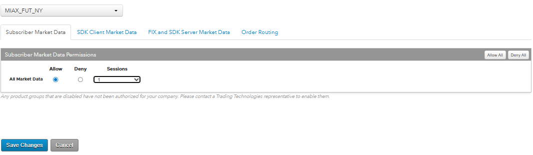 - Click the Subscriber Market Data tab to allow or deny access to All Market Data available at the exchange.