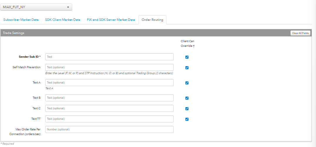- Client Can Override — Determines if a user can override the value in this field when submitting orders from trading applications or APIs. Check the check box to unlock the field and allow a user to override the value. When unchecked, the field is locked and the user cannot change it.