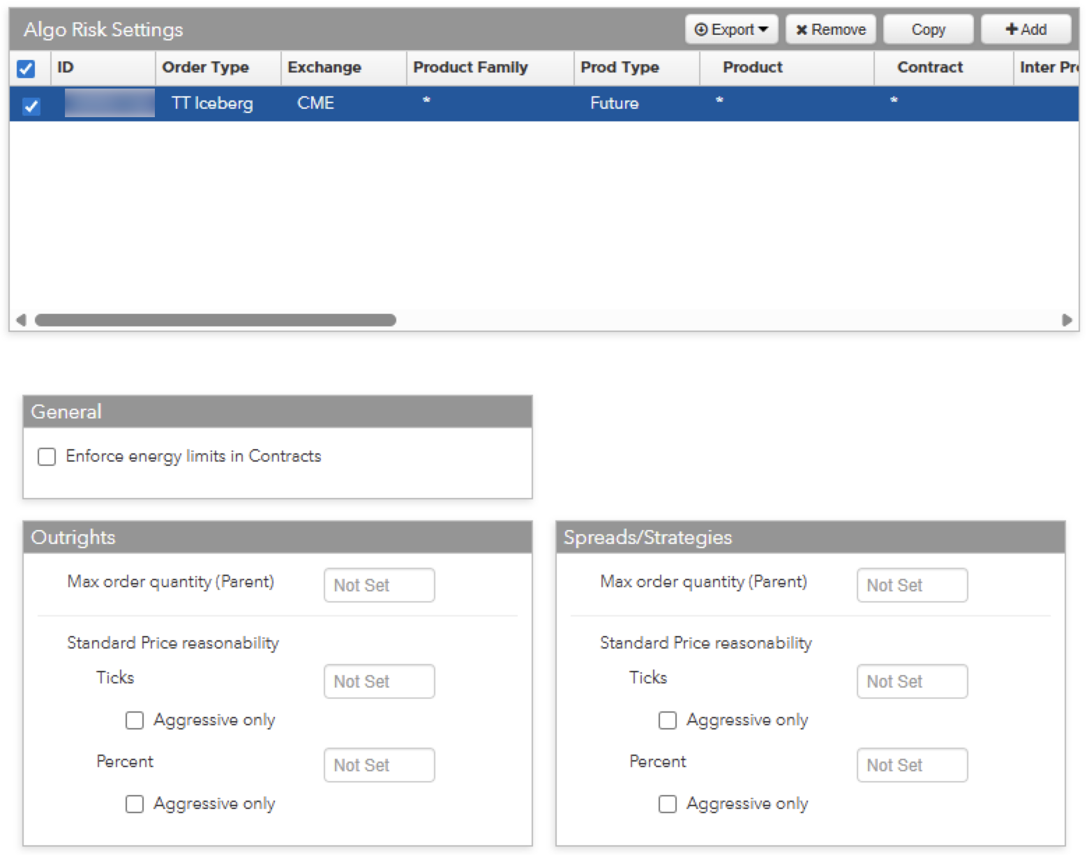 - Note: Limits configured without selecting a Product or Contract will apply to all instruments within the Product Type which have not been explicitly configured. For example, a limit set for TT Iceberg | CME | Future will apply to TT Iceberg orders across all CME Futures that do not have their own specific limit configured within Algo Risk Settings.
